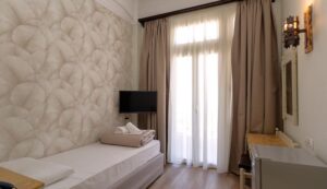 Our rooms have all the modern amenities. They are equipped with aluminum frames, air conditioning, refrigerator, 32” LED flat screen TV, wardrobe and beds with anatomical mattresses. They have a connection to an automatic telephone exchange and many of them have a private balcony. Their view is to town or to the pool. Access to them is by card key. Their bathrooms are equipped with a shower cabin, a hairdryer and free toiletries.