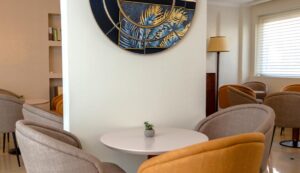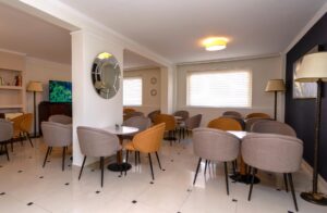 The recent renovation of the public area has highlighted an air of modern elegance with discreet touches of luxury. The central area was dressed with knitted beige wallpaper combined with deep blue, creating a sense of calm and depth. The choice of this shade refers to the element of water, in perfect harmony with the seaside identity of the hotel.